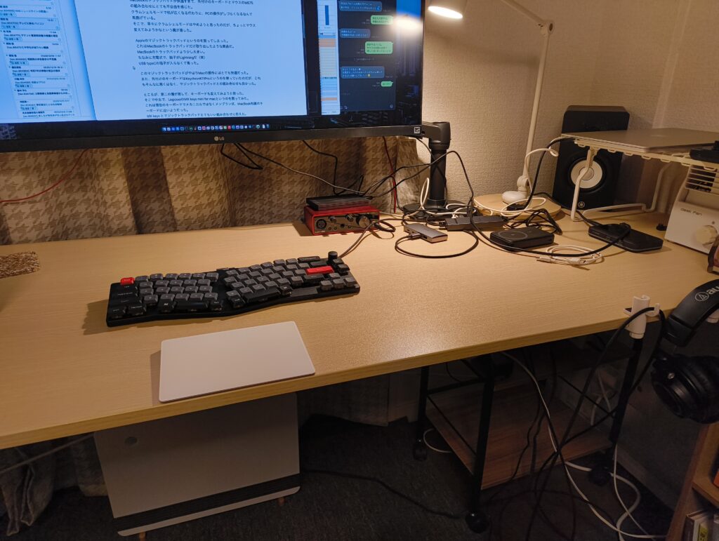 その後、やはりキーボードの沼に足を踏み入れてしまったみたいで、毎日のように手元にあるキーボードを試しては替え、マジックトラックパッドの位置もあーでもないこうでもないと、色々な場所において試している。