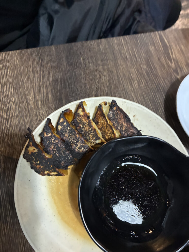 酔っ払っていて焦げてることしか気にならなかったが、写真をみるとでかい皿の端に餃子があって真ん中になドンとタレの皿が乗っているのだが、食べ終わったあとみたいで配膳もいまいちだと思った。