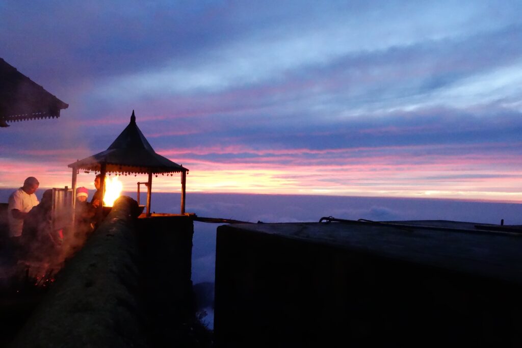 半袖短パンで登ったが、やはり最高峰ということで、夜は死ぬかと思うくらい寒かった。聖地なのでたくさんの人がいたが、だいたいみんな凍えていた。
